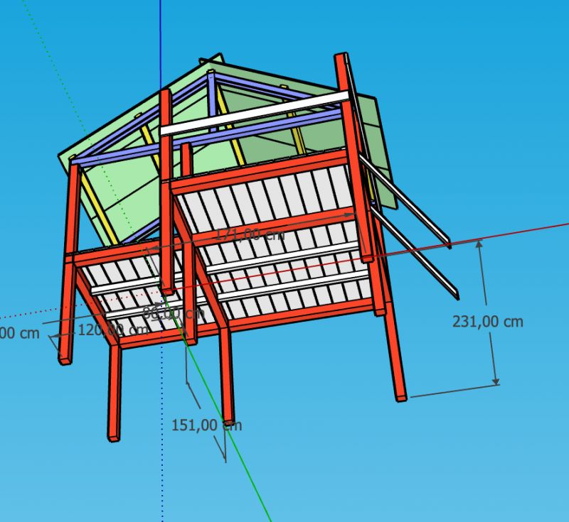 C'est une vue de haut, avec les carrés noirs représentants les poteaux, les rectangles bleus les lambourdes et les traits verts les boulonnages : A plusieurs endroits (indiqués en rouge) les boulonnages vont se croiser (à la même hauteur) ce qui n'est pas possible. Je ne doute pas que la solution est dans ton message, mais je n'arrive pas à voir comment résoudre ce problème...