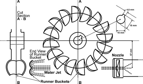 Un vieux système très employé: turbine du type « à action » car l’énergie potentielle de l’eau s'écoulant dans une conduite forcée est transformée en énergie cinétique par l'intermédiaire d’un jet d’eau qui agit directement sur les augets de la roue.