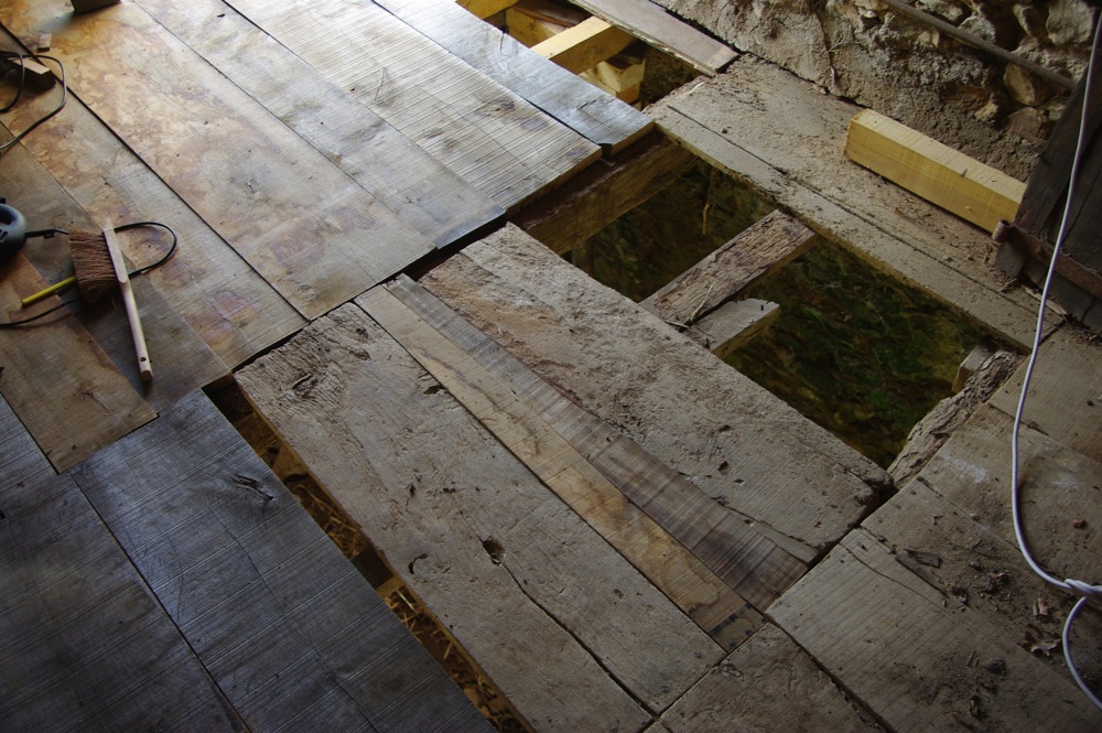 et le nouveau plancher, on a remplacé que les planches les plus moisies pour faire vite, mais je pense qu'à terme, il faudra tout remplacer. On a acheté les planches dans une scierie, du chêne brut à 8€ le mètre carré, bien sèches.