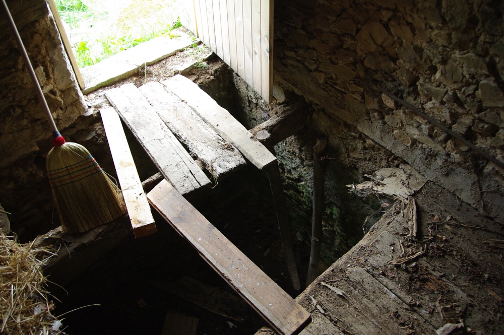 l'ancien âtre, une fois le ménage fait, on voit assez clairement le principe de faire un plancher plus bas, de remplir de terre et de terminer par des terres cuites, c'était intelligent comme principe minimaliste. Perso, je préfère surélever le foyer pour ranger en dessous les buches :