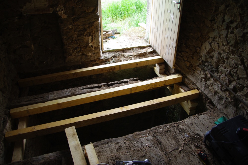 Les nouvelles poutres. Au début, je voulais remplacer la première poutre assez endommagée et puis, j'ai préféré rajouter les nouvelles, c'est plus rapide à mettre en place, d'autant qu'il est difficile de s'ancrer dans le mur de droite, tant il est humide.
