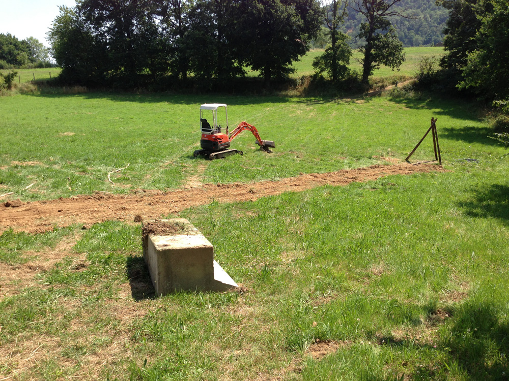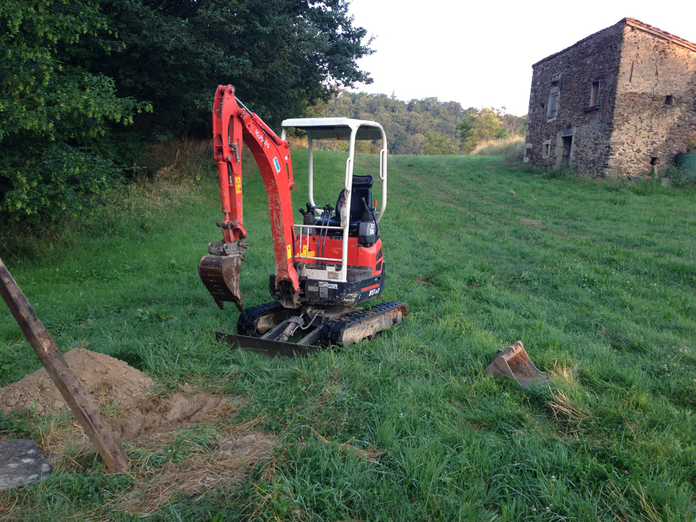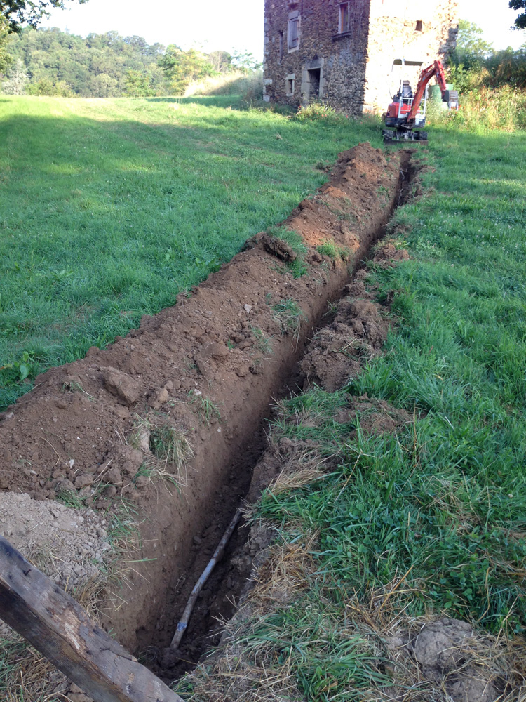 Le puits est à gauche à côté de la mini-pelle et la maison à 20 mètres. Pour info, manier une mini-pelle est un jeu d'enfant, si j'avais dù faire cette tranchée à la main, ça m'aurait pris au bas mot 3 jours, sans compter le rebouchage.