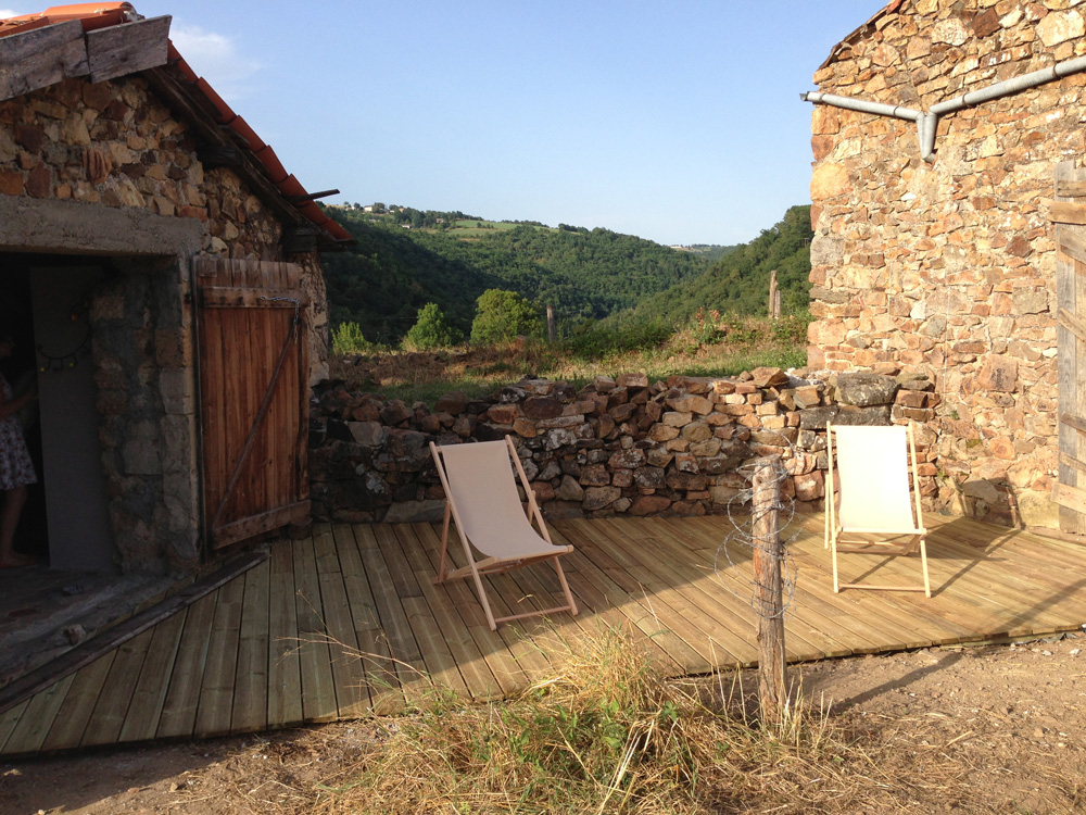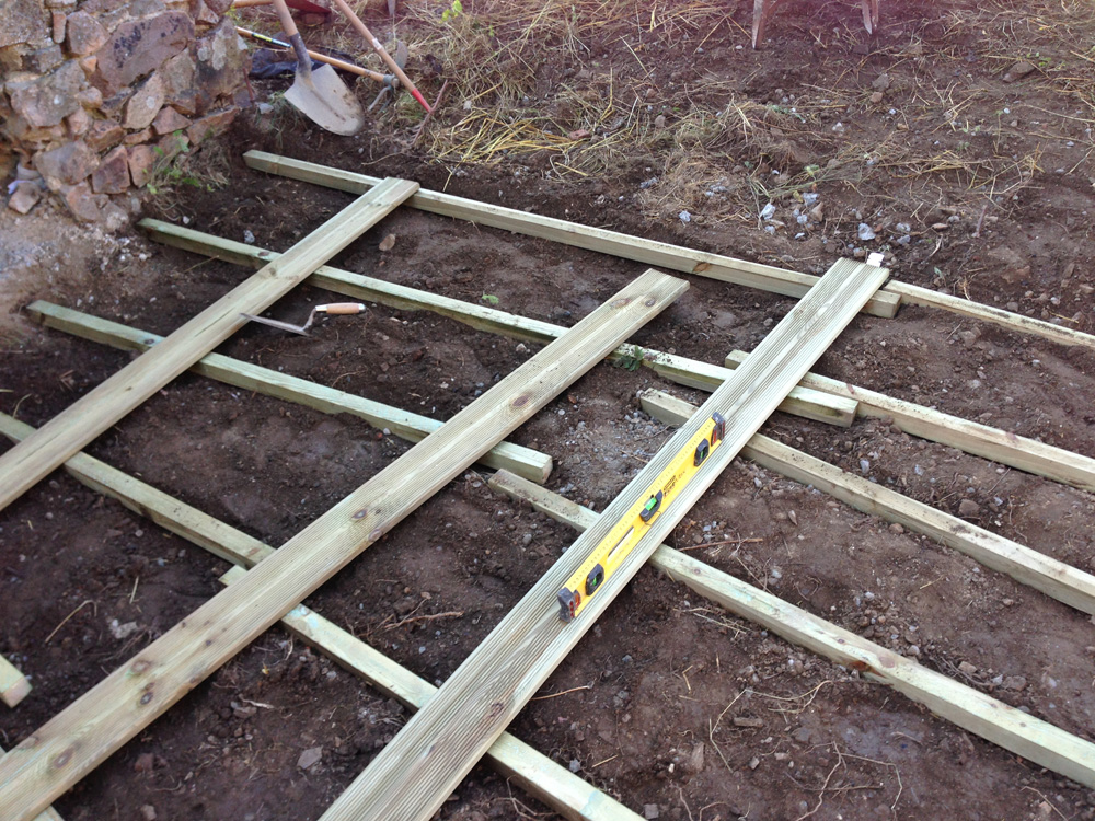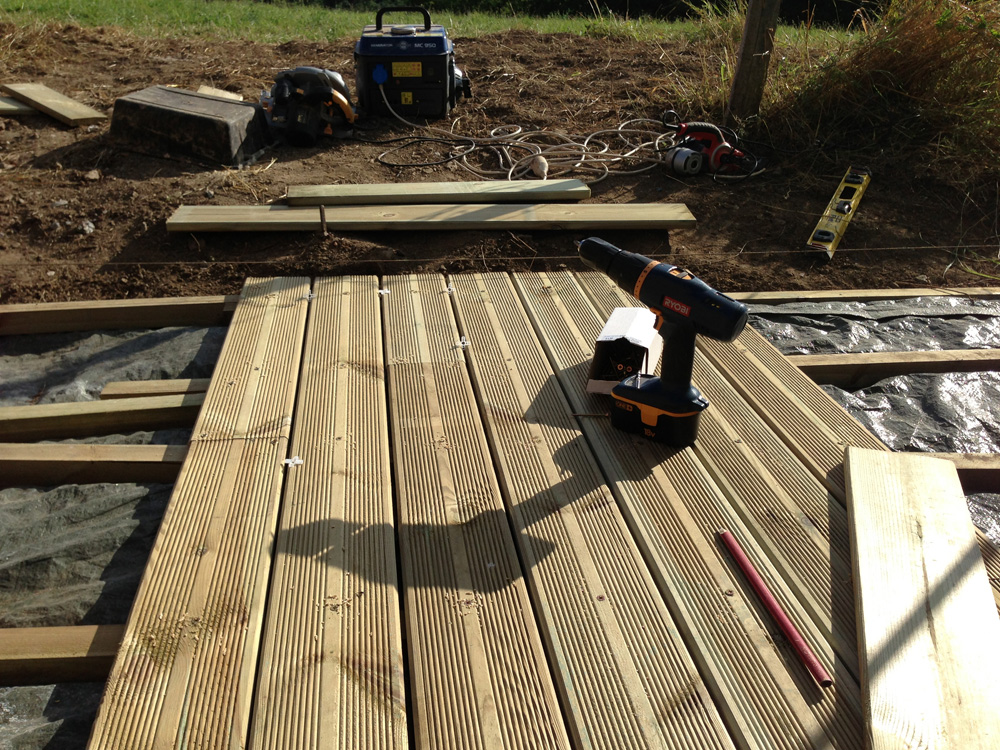 Un petit retour sur les première cabanes, si leur aménagement n'ont pas beaucoup avancé, en revanche, on en avait marre de voir les herbes folles entre les deux masures. On s'est interrogés sur le dallage à poser, puis finalement c'est une terrasse en bois, toute classique qui y a pris place.