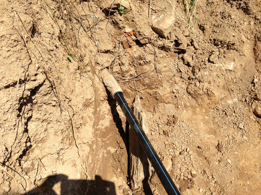 Après une heure de manettes, on peut voir le tuyau originel en plomb au fond de la tranchée :