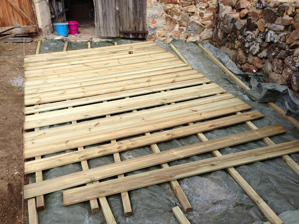 ça fait bail que je ne suis pas revenu sur le forum, mais bon an mal an, les travaux ont un peu avancé sur les cabanes, tout d'abord pour le plancher qui a bien avancé,